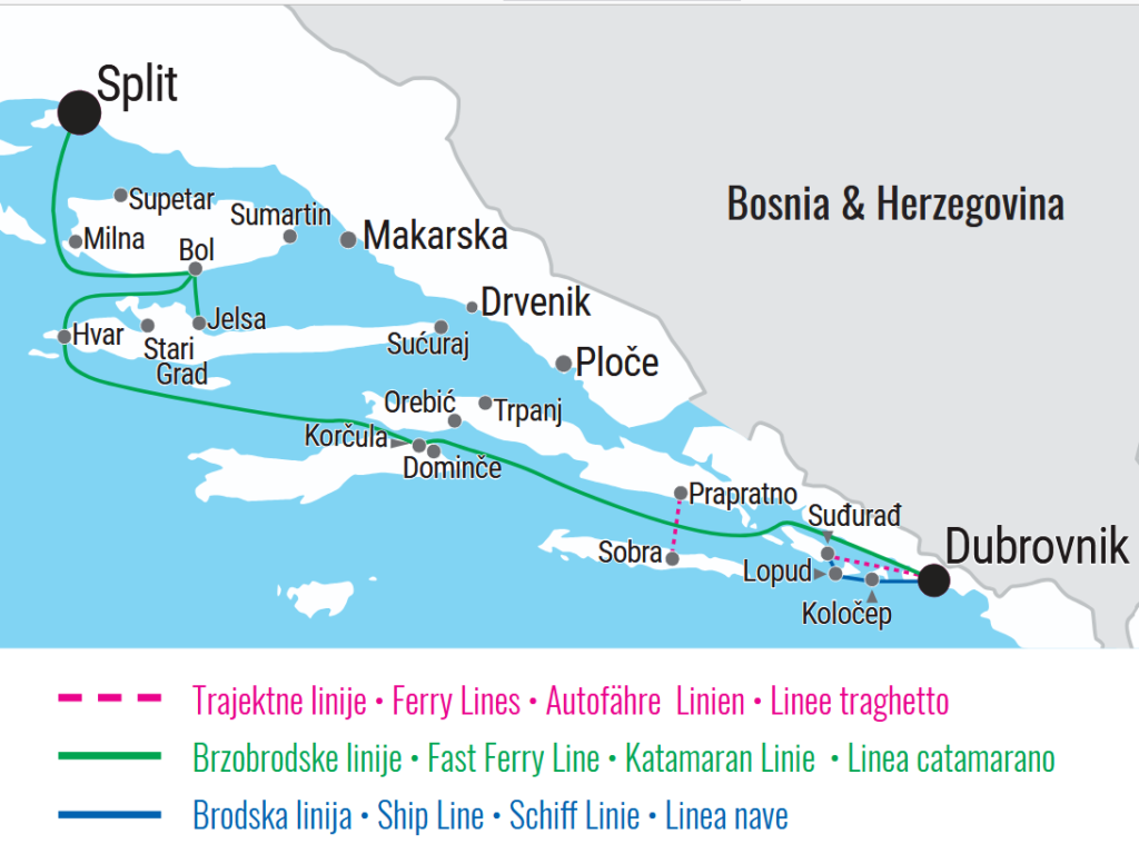 Jednym z najciekawszych rejsów jest linia Split – Hvar – Korčula – Mljet – Dubrownik, która działa sezonowo. Czas podróży wynosi około 5 godzin i 55 minut. Rejs obsługiwany jest przez szybkie katamarany bez możliwości przewozu pojazdów. Cena biletu dla osoby dorosłej wynosi od 45 do nawet 90 euro, w zależności od terminu i obłożenia.