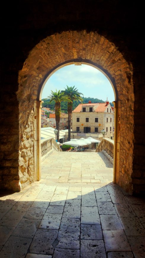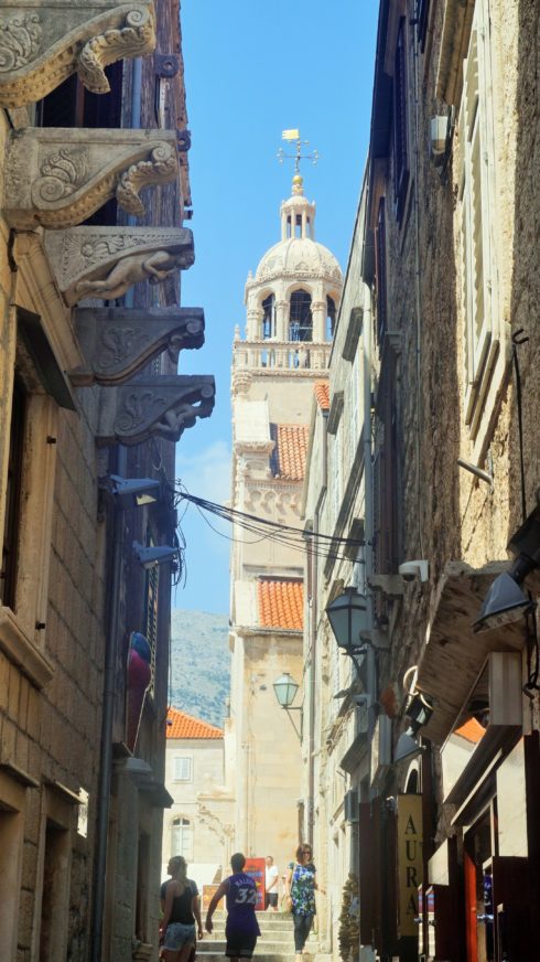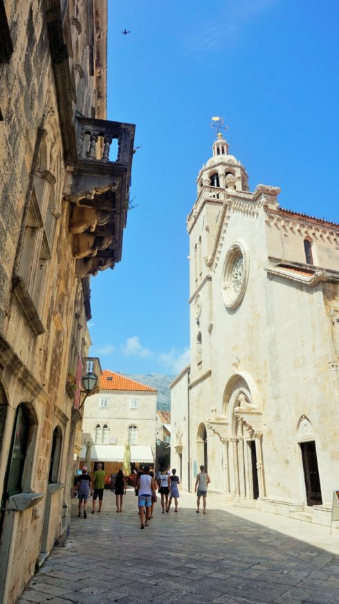 Korcula miasto to główne średniowieczne miasteczko na wyspie Korcula zbudowane na wzgórzu- półwyspie, z kamienia otoczone przez potężne mury obronne. Z lotu ptaka jego Starówka Korculi przypomina rybi szkielet. Zostało ono tak specjalnie zbudowane, aby docierał do wnętrza starówki ciepły wiatr jugo a zimny wiatr bora był blokowany. Starówka miasta Korcula jest malutka ma do 300 m długości i około 170 m szerokości.