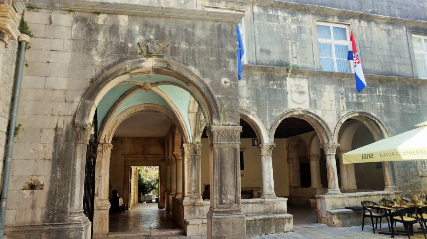 Plac św. Marka wyznacza podłużny środek miasta z katedrą św. Marka. Została ona wzniesiona w XV w. w miejscu starszej katedry, po której zostały absydy. Reprezentuje mieszane style gotyku i renesansu. Obok katedry stoi renesansowo-barokowy Pałac Opatów ze skarbcem. Zgromadzono w nim kolekcję ikon i przedmiotów liturgicznych. Po drugiej stronie placu stoją 2 pałace. Pałac Arneri w stylu gotyckim oraz Pałac Gabrielis w stylu renesansowym, w tym drugim obecnie mieści się Muzeum Miejskie z wystawą dotyczącą historii miasta i wyspy Korcula. Do ciekawszych eksponatów należą modele statków wyprodukowanych w miejscowych stoczniach.