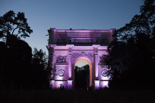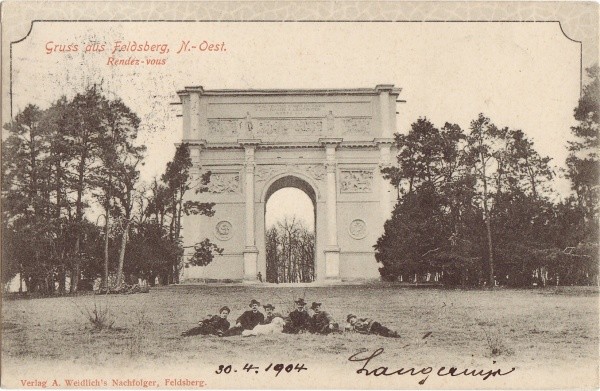 Łuk triumfalny powołujący się na starożytną tradycję powstał z trzech powodów. W momencie budowy oficjalna historiografia książęca Liechtensteinu promowała legendę barokowej rodziny, zgodnie z którą założycielem rodziny rzymskiej był patrycjusz Gajusz Actius, który żył w IV wieku. Ponadto podobny łuk był częstym dodatkiem do parków krajobrazowych w Anglii.