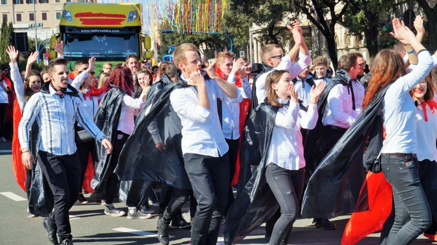 Kulminacją całego święta jest Wielka Parada Karnawałowa, która co roku przyciąga setki tysięcy widzów. To właśnie wtedy Rijeka zamienia się w teatr pod gołym niebem. Przez centrum miasta przechodzi kilkadziesiąt grup – lokalnych stowarzyszeń, szkół, zespołów tanecznych i orkiestr dętych. Każda z nich przygotowuje własne kostiumy i platformy tematyczne – od baśniowych smoków po polityczne satyry.