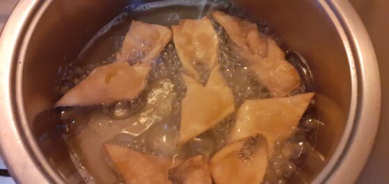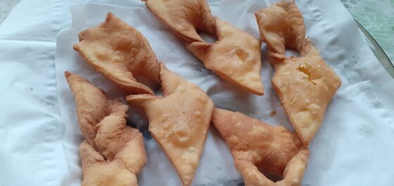 - Uformowane faworki wkładam do rozgrzanego smalcu (lub oleju) po kilka sztuk faworków jednocześnie. Podczas smażenia chrust nieco urośnie i pokryje się pęcherzami powietrza, to naturalne :). Smażę na złoty kolor około 30 – 60 sekund z każdej strony.