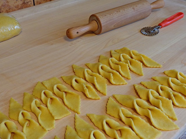 - Wracam do faworków. Nożem (lub radełkiem) wycinam paski, oczywiście mniejsze niż średnica garnka ze smalcem. W centrum każdego paseczka robię małe nacięcie, przez które przekładam jeden koniec paska. Jak już faworek będzie miał ładny kształt, odkładam na bok i przygotowuję resztę.