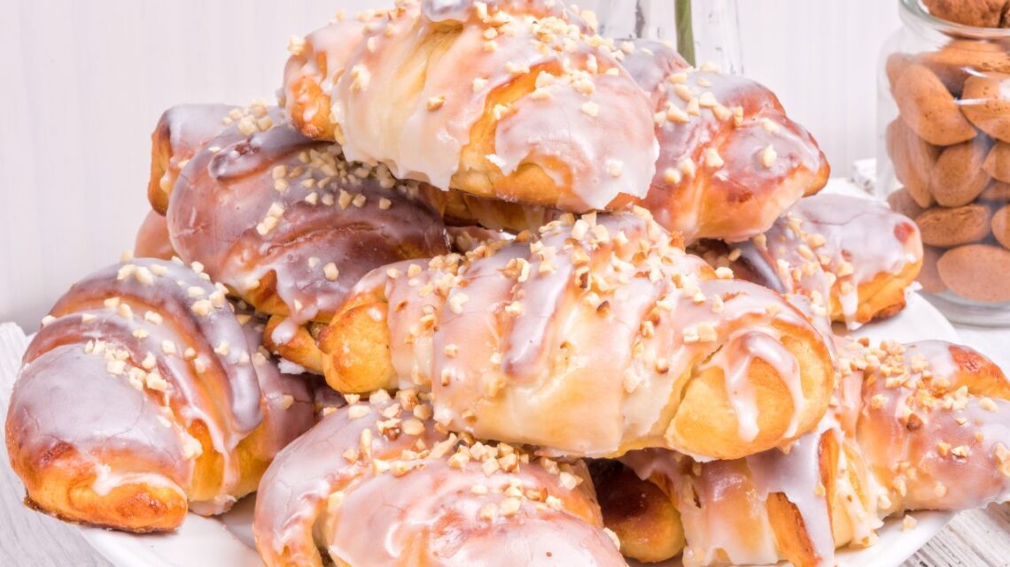 Tak przygotowane rogaliki zostawiamy do wyrośnięcia (aż podwoją swoją wielkość). W tak zwanym międzyczasie rozgrzewamy piekarnik do około 180º C (z termoobiegiem) lub 200 stopni bez. Tak wyrośnięte rogale smarujemy na wierzchu jajkiem rozrobionym z wodą (1:1) i pieczemy około 15-17 minut, aż się ładnie zarumienią. Następnie ciepłe rogaliki świętomarcinśkie lukrujemy (z odrobiną soku z cytryny) według uznania oraz posypujemy orzechami.