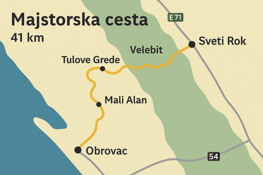 Podróżując Majstorską Cestą, warto mieć przy sobie dokładną mapę topograficzną lub korzystać z aplikacji GPS. Droga ma długość ponad 40 km i biegnie przez liczne zakręty, serpentyny oraz punkty widokowe. Kluczowe punkty na mapie to miejscowości Obrovac i Sveti Rok jako bramy wjazdowe, przełęcz Mali Alan, formacje skalne Tulove Grede, a także historyczne kapliczki i dawne fortyfikacje rozmieszczone wzdłuż trasy.