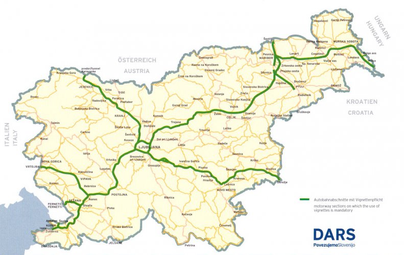 - Autostrada Gorenjska (A2) – na odcinku z Austrii do węzła Hrušica w kierunku Słowenii oraz od węzła Hrušica do granicy w kierunku Austrii. Opłata za przejazd tym odcinkiem jest uiszczana razem z opłatą za przejazd tunelem Karavanke i obejmuje odcinek pomiędzy pierwszymi węzłami autostradowymi po obu stronach granicy (węzeł Hrušica w Słowenii; węzeł Podrožca – Rosenbach w Austrii).
