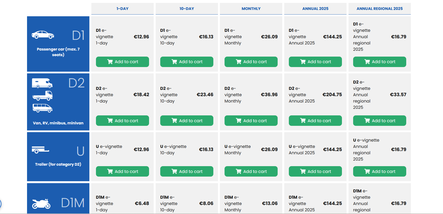 - Winieta kategoria D1 – motocykle (D1M), oraz samochody osobowe o dopuszczalnej masie całkowitej co najwyżej 3,5 t, przystosowane do przewozu do 7 osób z kierowcą włącznie i ich przyczepy.